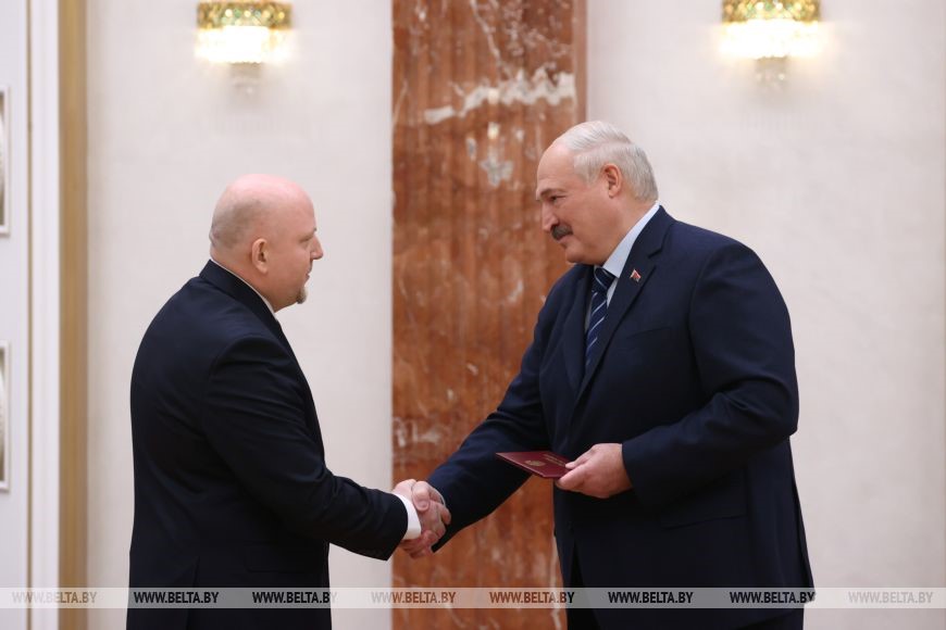Вручение диплома доктора наук заведующему кафедрой онкологии с курсом ФПК и ПК Е.А. Шляхтунову Главой государства Президентом Республики Беларусь А.Г. Лукашенко (2024 г.)