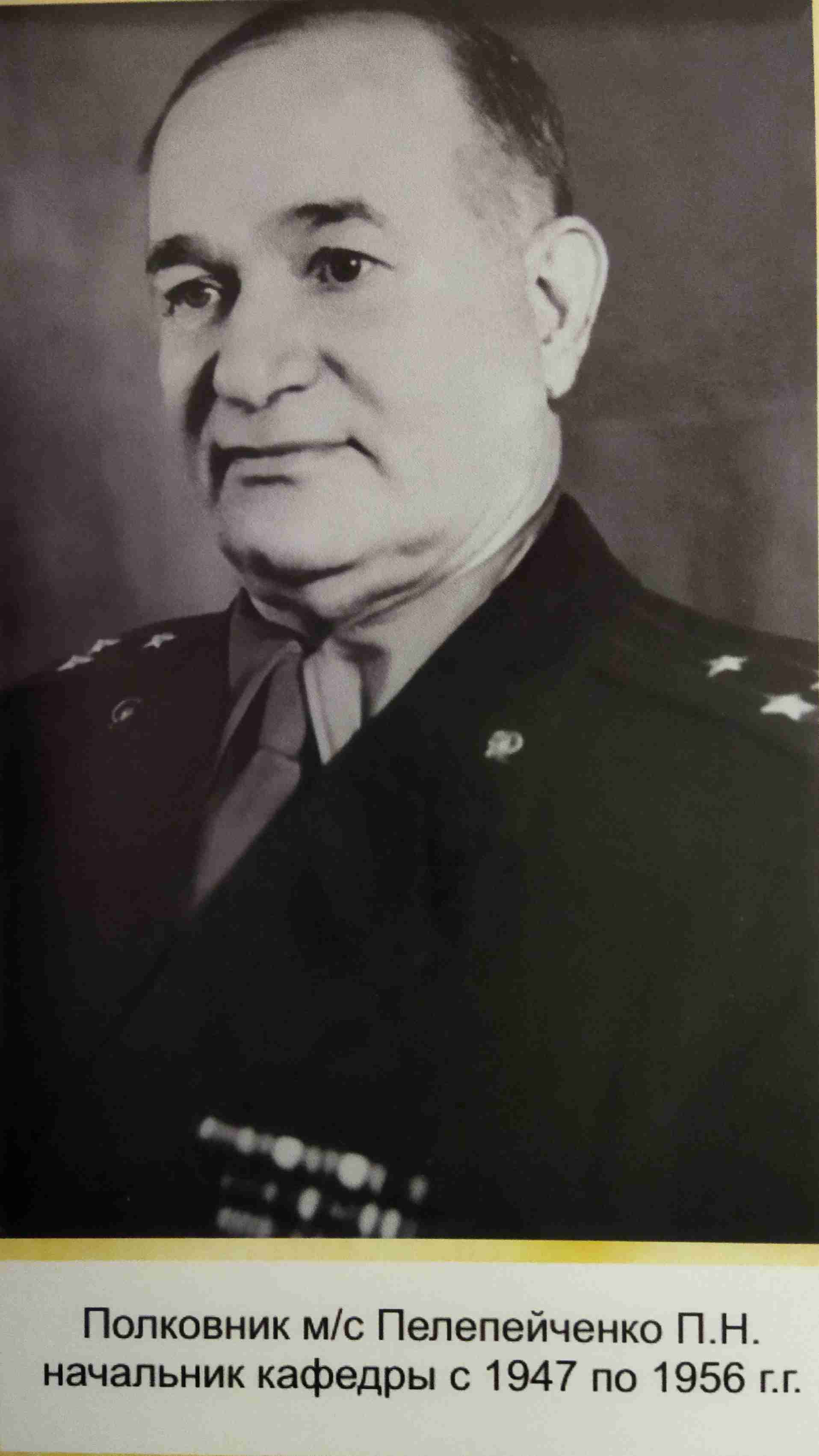 Первым начальником военной кафедры (1947-1956 гг.) был полковник медицинской службы Пелепейченко Петр Лаврентьевич. В период гражданской войны в 1918-1919 гг., Пелепейченко П.Л. служил в качестве ординатора военного госпиталя. Как участник Великой Отечественной войны он награжден орденами «Ленина», «Красного Знамени», «Красной Звезды», орденами «Отечественной войны» I и II степени, медалями «За победу над Германией в войне 1941-1945 годов», «За взятие Кенигсберга», «За взятие Берлина».