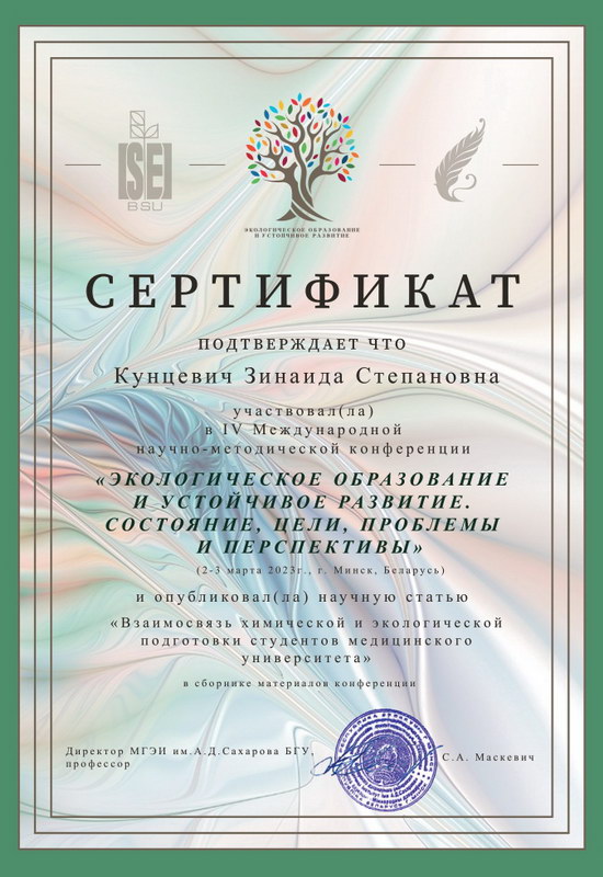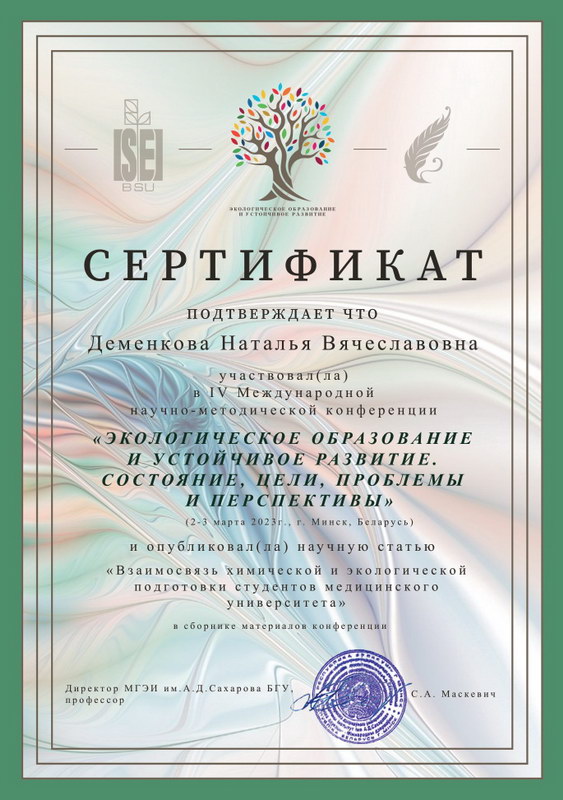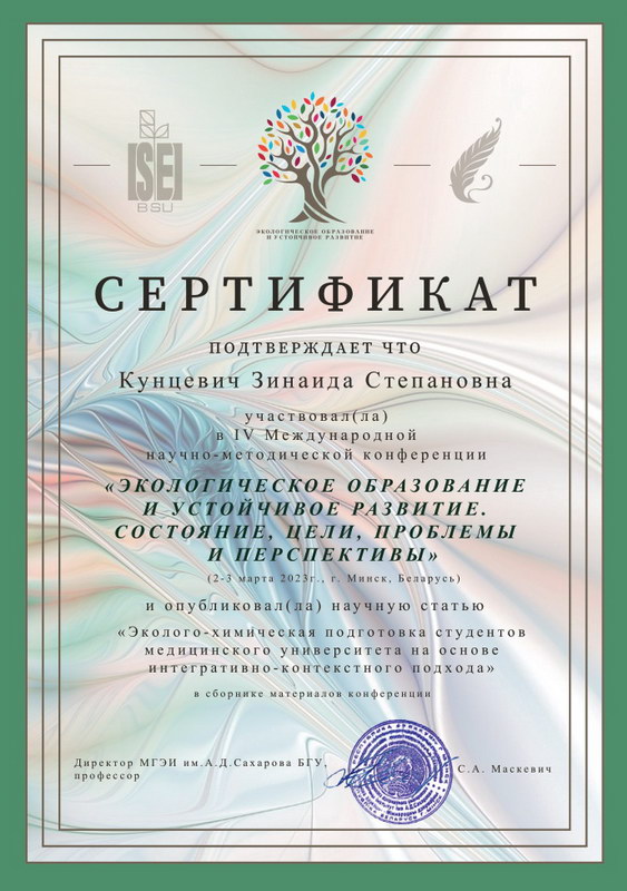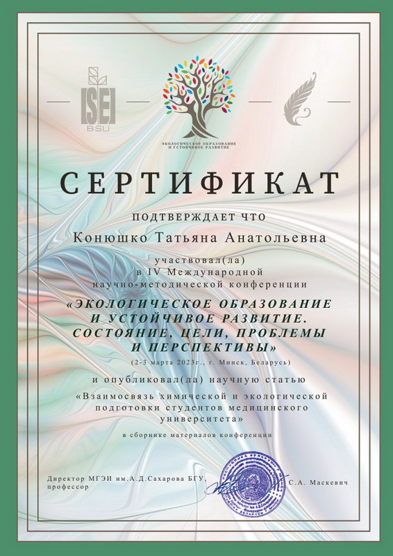 Участие в работе конференции позволило преподавателям и студентам познакомиться с актуальными современными экологическими проблемами, представить свои исследования, обменяться опытом работы в области экологического образования студентов медицинского университета с коллегами из учреждений образования Беларуси и Российской Федерации.