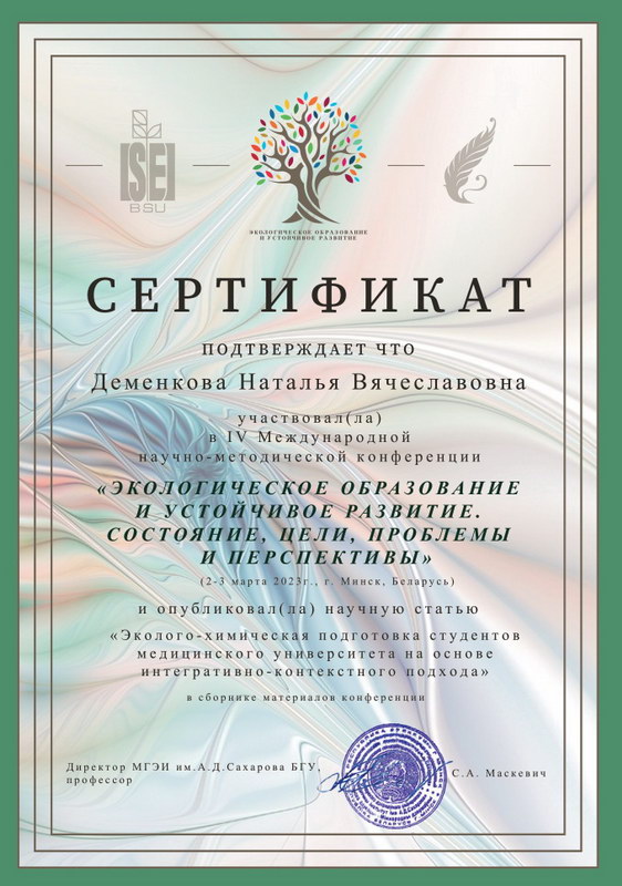24-го октября в ВГУ имени П.М. Машерова состоялась Международная научно-практическая конференция студентов, аспирантов и молодых ученых «XIX Машеровские чтения», в работе которой приняли участие старшие преподаватели кафедры общей и органической химии Деменкова Н.В. и Конюшко Т.А.