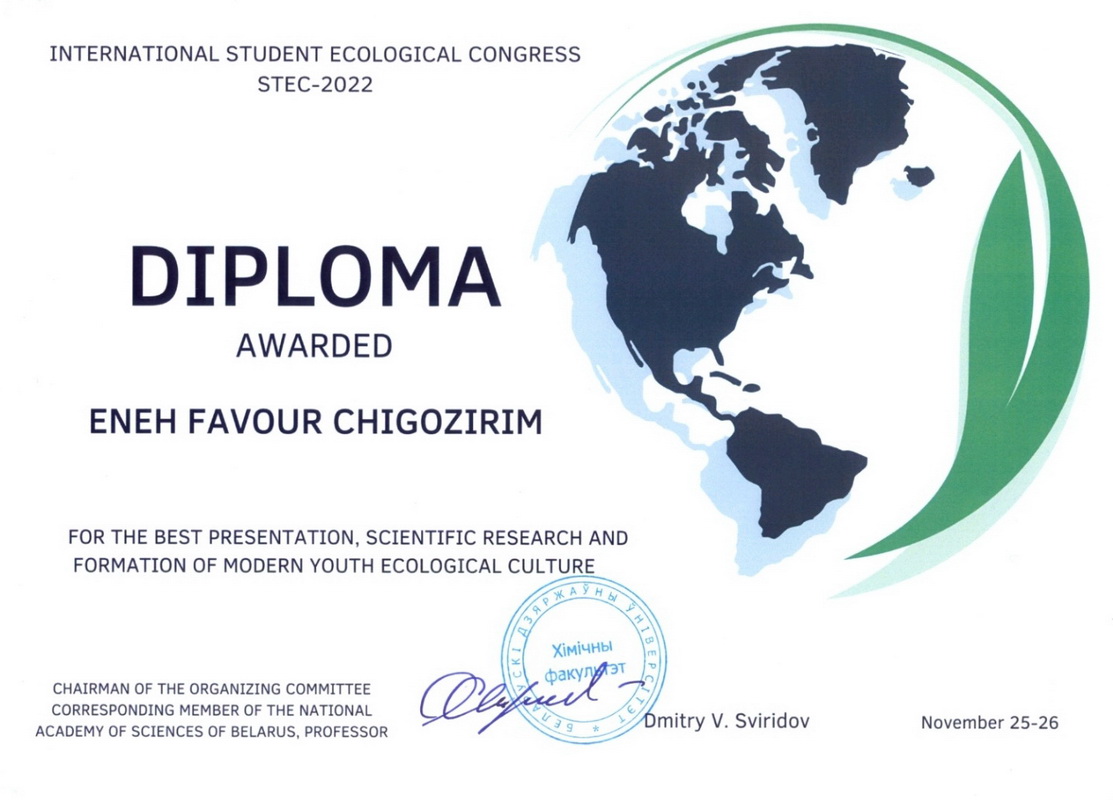 Студенты ВГМУ – члены студенческого научного кружка кафедры общей, физической и коллоидной химии: Ибезим Прэйс Одивонма, Энэх Фейвор Чигозирим, приняли участие в работе 5-ого Международного студенческого экологического конгресса StEC-2022 (25-26 ноября 2022 г.), организаторами которого являются химический кластер БГУ и студенческий проект Shadow Day BSU, и получили достойные награды.