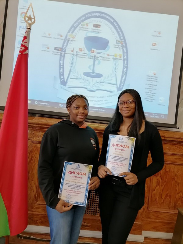 Студенты второго курса факультета подготовки иностранных граждан (специальность «Фармация») Ибезим Прэйс и Энэх Фейвор Чигозирим - члены студенческого научного кружка кафедры общей физической и коллоидной химии, приняли участие в VIII Международной научно-практической конференции иностранных студентов и магистрантов «Иностранные студенты – белорусской науке», которая проходила 19 апреля на базе УО «Витебская ордена «Знак Почета» государственная академия ветеринарной медицины» и получили достойные награды. Их доклады удостоены дипломов I степени. Научные руководители работ студентов: З.С. Кунцевич, Т.О. Кононова. Заведующий кафедрой общей, физической и коллоидной химии З.С.Кунцевич получила благодарность руководства УО «Витебская ордена «Знак Почета» государственная академия ветеринарной медицины» за эффективное научное руководство исследовательскими работами студентов.