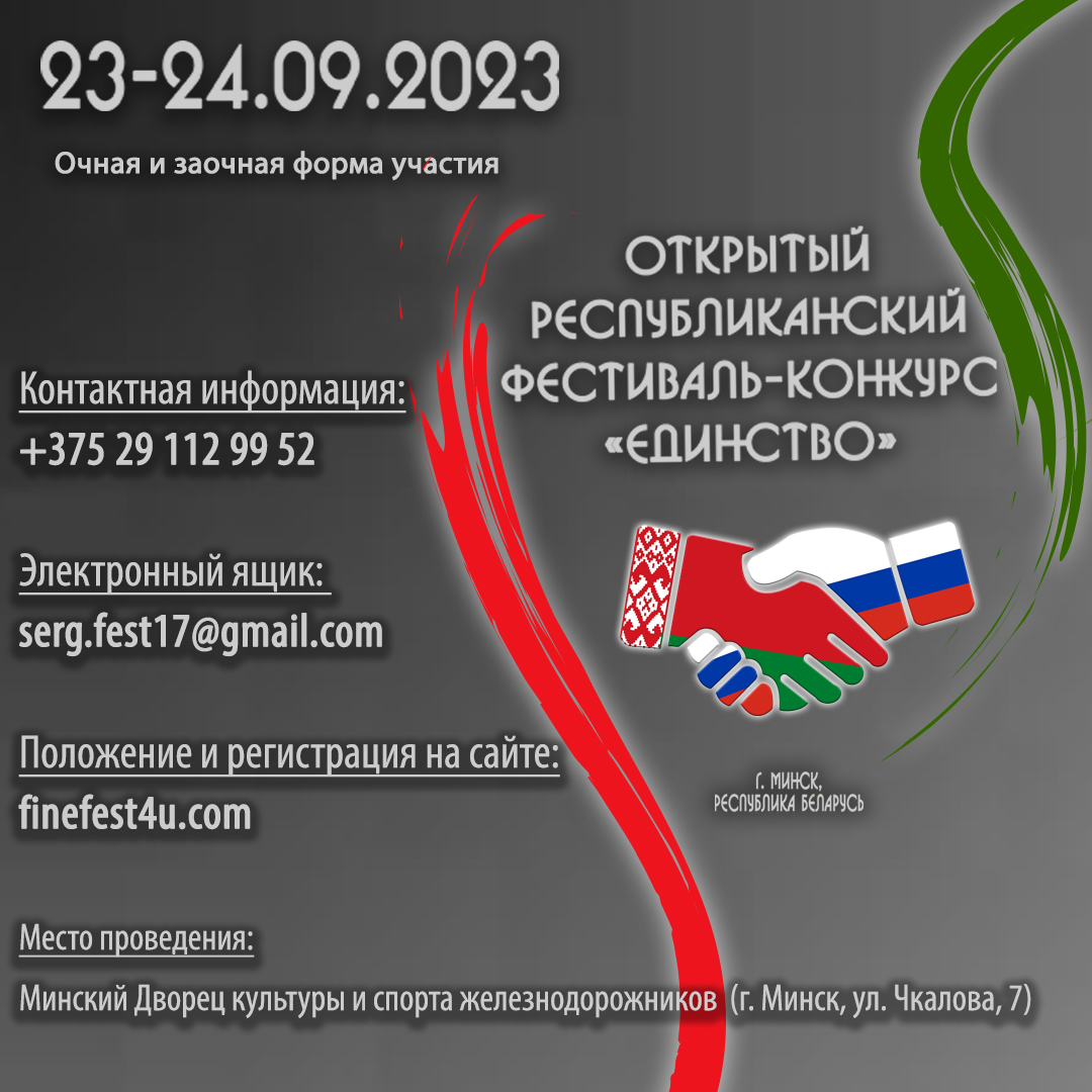 23-24 сентября 2023 года, планируется проведение Открытого Республиканского фестиваля-конкурса «ЕДИНСТВО». Конкурс, главной целью которого является развитие союзнических отношений между Российской Федерацией и Республикой Беларусь, обеспечение мирного развития народов двух государств, патриотического воспитания населения, выявление талантливых детей и молодежи, поддержка детского и юношеского творчества.
