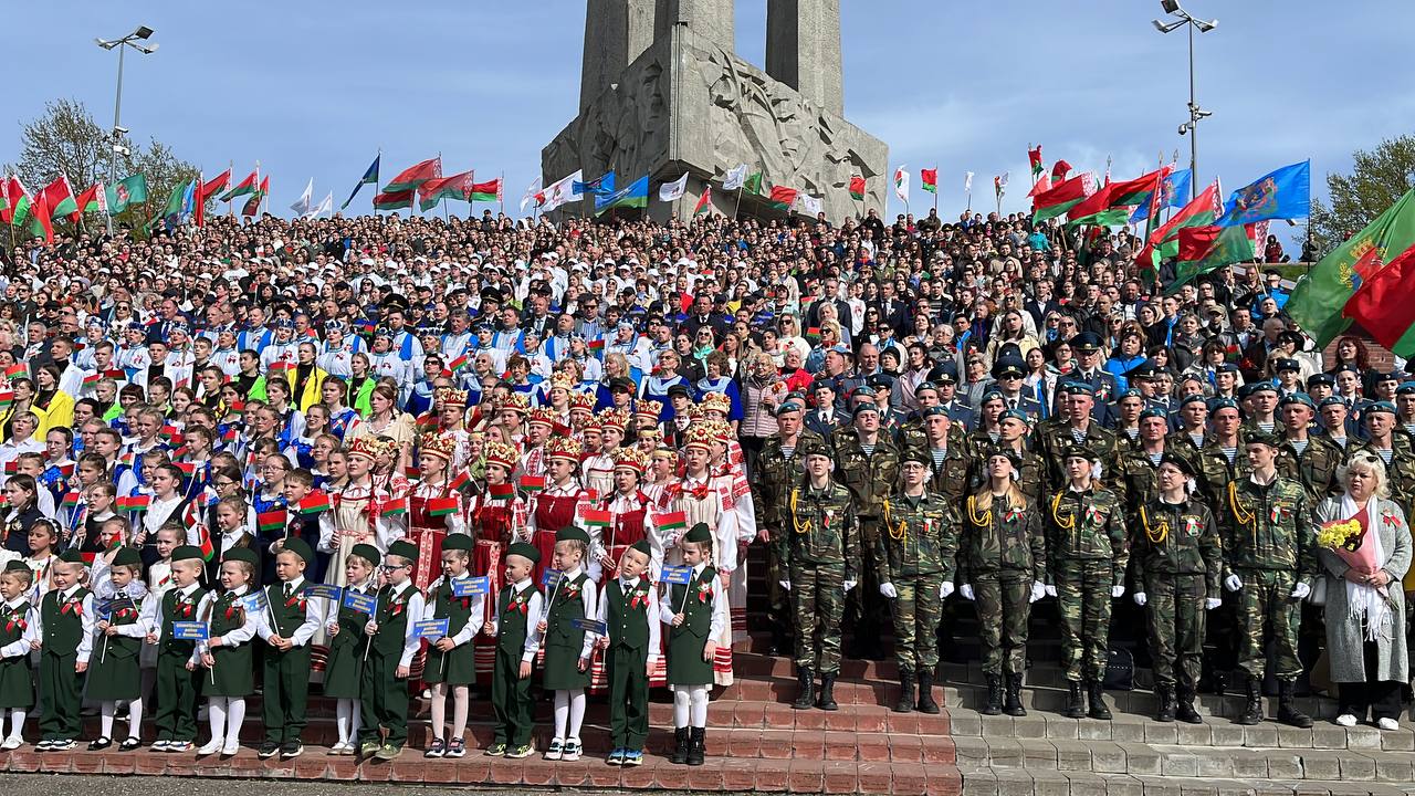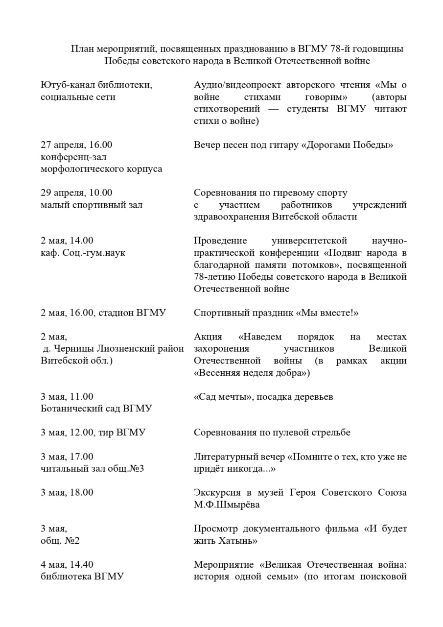 2 мая администрация университета, студенты и сотрудники во главе с ректором ВГМУ А.Н. Чукановым приняли участие в районной акции «Споём песни Победы вместе» и торжественном возложении цветов на площади Победы у мемориального комплекса в честь советских воинов, партизан и подпольщиков Витебщины.