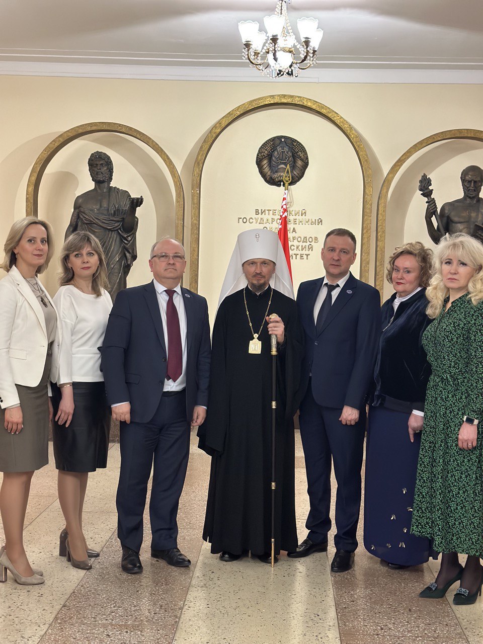 6 апреля состоялась встреча руководства ВГМУ с Митрополитом Минским и Заславским Вениамином, Патриаршим Экзархом всея Беларуси. Об истории и современности университета, о направлениях, которые реализуются в рамках сотрудничества ВГМУ с Белорусской Православной Церковью, рассказала проректор по воспитательной и идеологической работе Н.Г. Болтрушевич. Ректор университета А.Н. Чуканов поделился с почётными гостями новыми перспективными проектами в рамках сотрудничества, заверив, что все они будут реализованы.