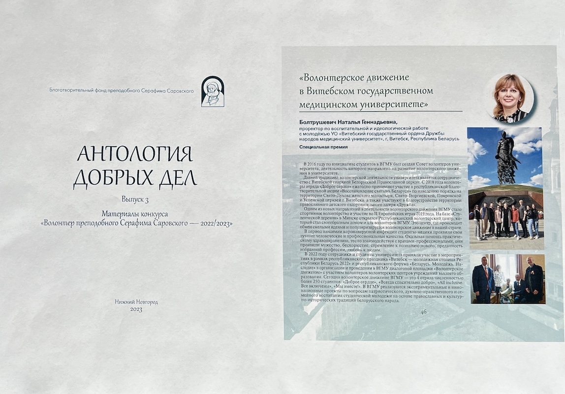 diveev 01Специальной премии Международного конкурса «Волонтёр преподобного Серафима Саровского - 2022/2023» удостоена проректор по воспитательной работе Болтрушевич Н.Г. Традиционно по итогам конкурса издан 3 выпуск сборника «Антология добрых дел», в который вошёл проект «Волонтёрское движение в Витебском государственном медицинском университете». Авторы проекта: проректор по воспитательной работе Болтрушевич Н.Г., педагог-организатор ОВРсМ Назарев С.М., воспитатель ОВРсМ Бербероглу Г.И.