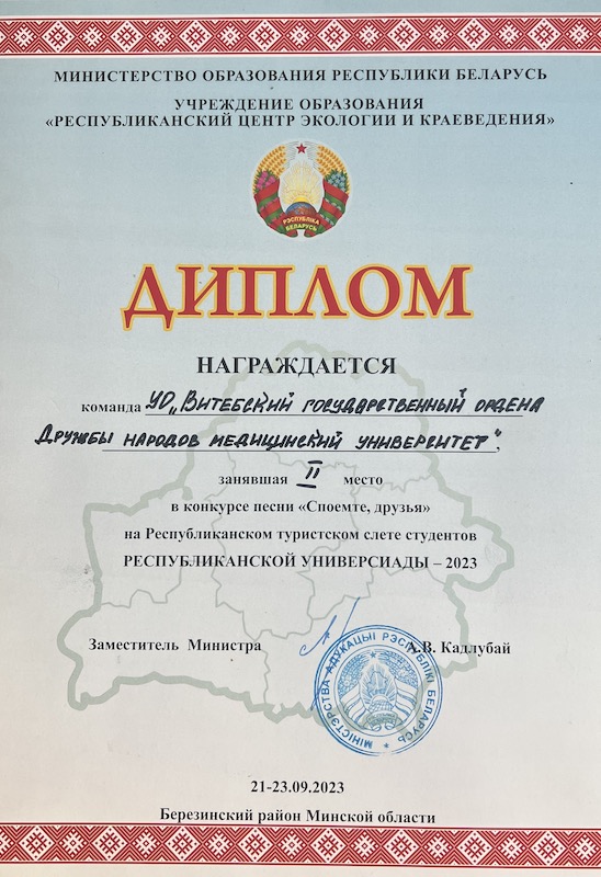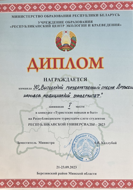 С 21 по 23 сентября 2023 года на территории Березинского района Минской области (д. Жорновка) проходил Республиканский туристский слет студентов Республиканской универсиады-2023. В слете приняли участие 17 команд учреждений высшего образования Республики Беларусь, в том числе и студенты ВГМУ.