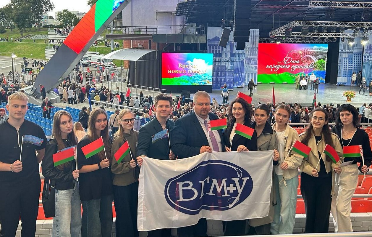 17 сентября 2025 года студенты и сотрудники ВГМУ во главе с первым проректором Алиной Щупаковой и проректором по идеологической и воспитательной работе Дмитрием Кужелем стали участниками патриотического форума «Время выбрало нас. Время новых побед!», посвящённого Дню народного единства.