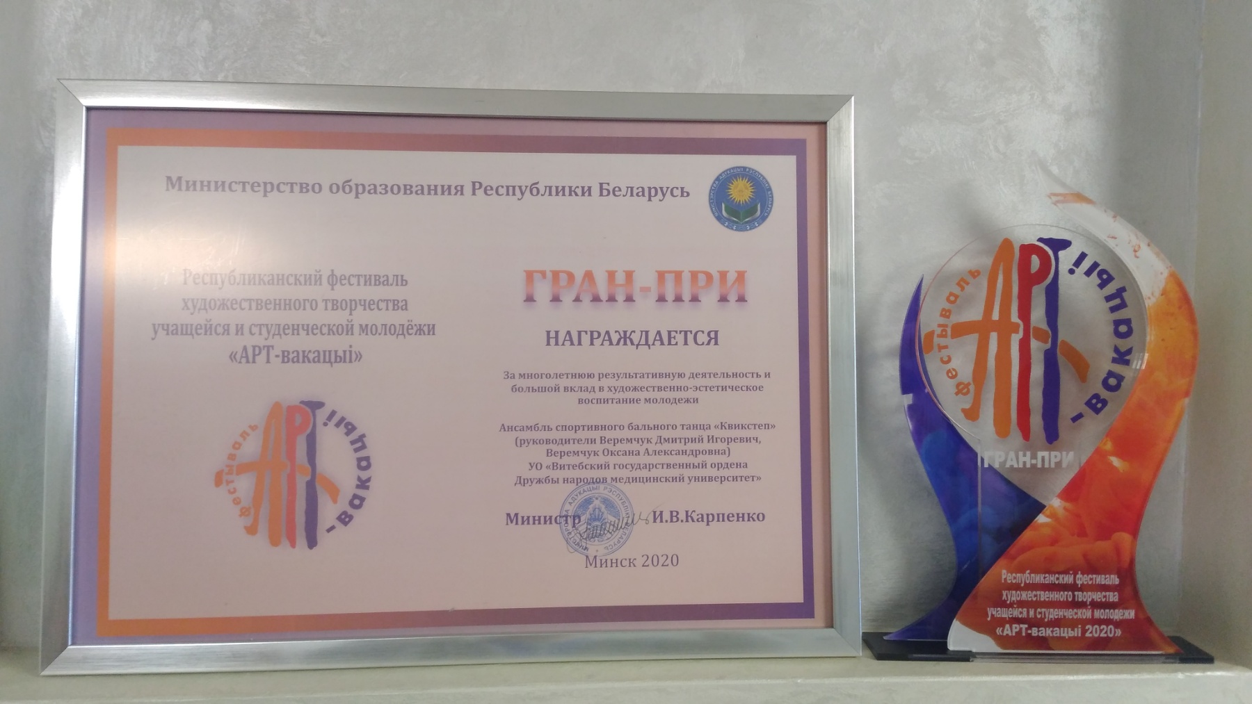 Главным событием насыщенного дня стала торжественная церемония открытия республиканского праздника «Гродно – Молодежная столица Республики Беларусь-2021». Приветствовал участников праздника Министр образования Игорь Карпенко. В рамках открытия состоялась церемония награждения, на которой ВГМУ вручили Гран-при Республиканского фестиваля художественного творчества учащейся и студенческой молодёжи «АРТ-вакацыі 2020» за многолетнюю результативную деятельность и большой вклад в художественно-эстетическое воспитание молодежи. Этой высокой награды был удостоен ансамбль спортивного бального танца «Квикстеп» (руководители Веремчук Д. И., Веремчук О.А.).