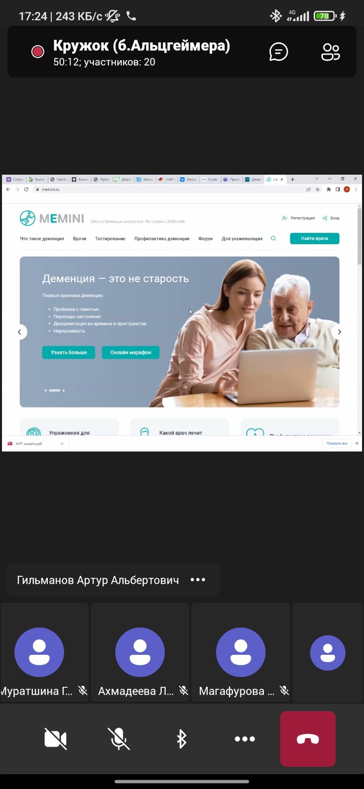 В ходе работы, студентка 3 курса лечебного факультета Линкевич К.В., познакомила участников с основными направлениями работы СНК кафедры медицинской реабилитации и физической культуры по вопросам реабилитации в гериатрии. От модератора поступило предложение о подготовке нашими студентами доклада об основных направлениях медико-социальной работы у пациентов с синдромом когнитивный нарушений и деменцией.