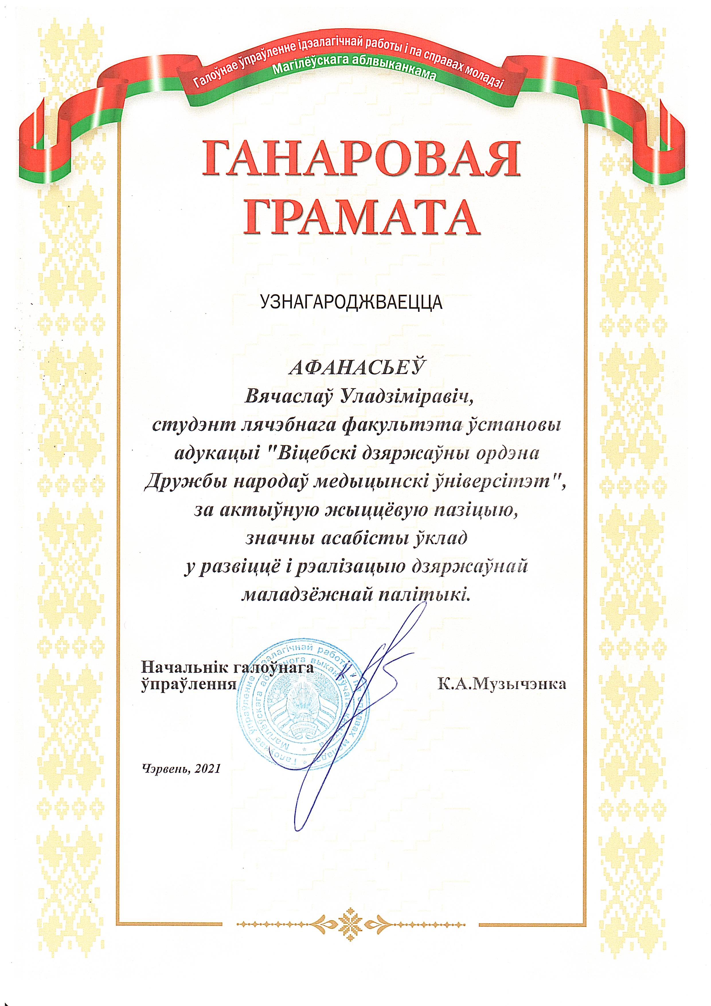 Уже во второй раз студент 4 курса лечебного факультета ВГМУ Вячеслав Афанасьев стал финалистом республиканского молодежного инновационного проекта «100 идей для Беларуси». В 2021 году Вячеслав разработал проект «STDControl» в номинации "Коммуникации". За активную жизненную позицию, значительный вклад в развитие и реализацию государственной молодёжной политики в Могилёвской области Вячеслав Афанасьев награждён Почётной грамотой главного управления идеологической работы и по делам молодёжи Могилёвского облисполкома. Поздравляем и желаем новых успехов!