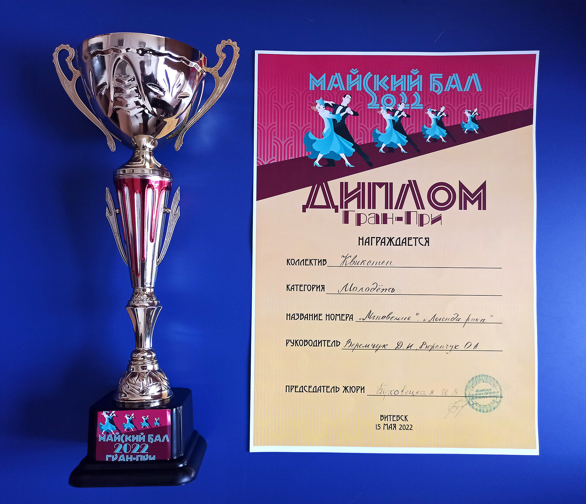 15 мая 2022 года в Концертном зале «Витебск» прошёл Открытый областной конкурс среди ансамблей и коллективов по спортивным танцам, бальному танцу и другим видам хореографии «Майский бал – 2022». В старшей возрастной группе, в которой был представлен 41 конкурсный номер, ансамбль спортивного бального танца «Квикстеп» (руководители Дмитрий Игоревич и Оксана Александровна Веремчук) завоевал Гран-при и специальный приз жюри «За музыкальную выразительность». Поздравляем и желаем дальнейших успехов! Так держать, ВГМУ!