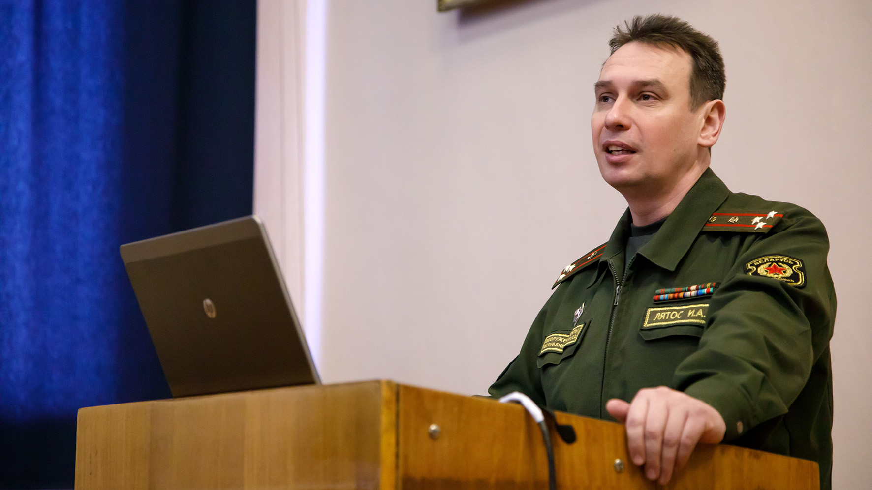 Начальник учебной части, заместитель начальника военной кафедры, к.м.н., полковник медицинской службы И.А.Лятос, который являлся спикером площадки, представил участникам презентацию «Выводы из оценки военно-политической обстановки вокруг Республики Беларусь, её влияние на военную безопасность и прогноз развития».