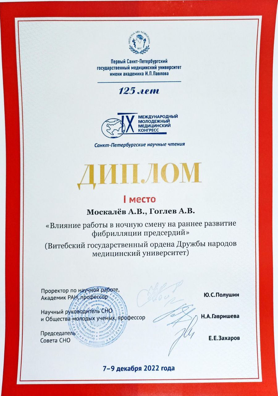 Москалёв Александр, студент 5 курса лечебного факультета, и Гоглев Алексей, студент 6 курса лечебного факультета нашего университета, заняли 1 место на IX Международном Молодежном Медицинском Конгрессе «Санкт-Петербургские научные чтения – 2022», который состоялся в Первом Санкт-Петербургском государственном медицинском университете им. акад. И.П. Павлова 7 – 9 декабря 2022 года, с устным докладом «Влияние работы в ночную смену на раннее развитие фибрилляции предсердий» (научный руководитель – доцент кафедры патологической физиологии Генералова А.Г.).