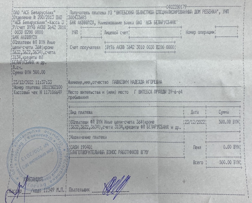 Членами первичной организации и сотрудниками университета подготовлены подарки для детей-инвалидов, жителей г. Витебска Никифорова Егора, 14-ти лет, Пяста Александра, 13-ти лет и Черепова Александра, 13-ти лет.