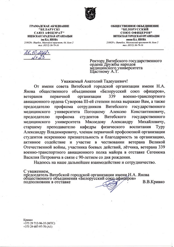 Витебская городская организация Республиканского общественного объединения “Белорусское Общество Красного Креста” благодарит лично Вас, а также врачей, которые принимали участие в консультативных приёмах пациентов в рамках благотворительной акции “К врачу!”, приуроченной к Международному дню пожилого человека: