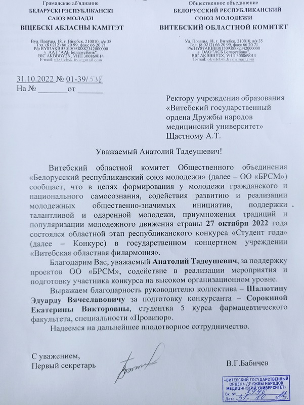 УО "Витебский государственный ордена Дружбы народов медицинский университет", 210009, г. Витебск, пр-т Фрунзе, 27