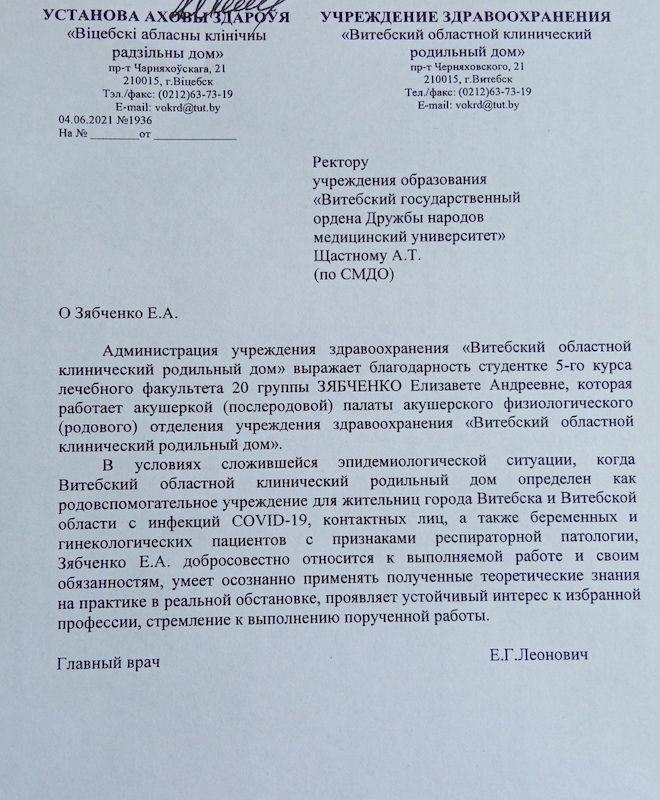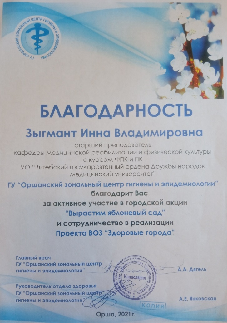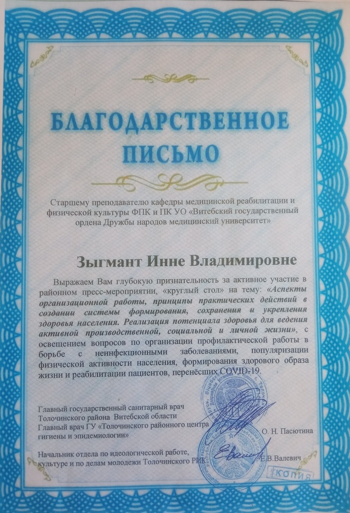 Благодарность от Витебской областной организации Белорусского профсоюза работников здравоохранения
