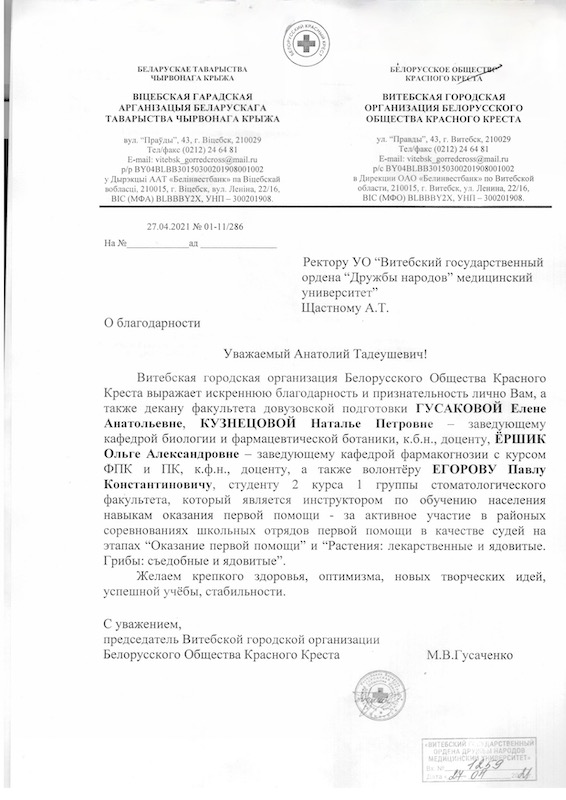 Выражаем Вам глубокую признательность, благодарим за оказанное содействие и организацию участия студентки 4 курса лечебного факультета Яны Семижон и студента 3 курса лечебного факультета Валентина Пелипенко в концертной программе.