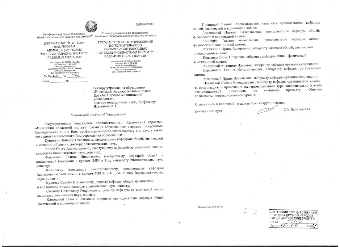 Благодарность от Государственного учреждения образования «Университет гражданской защиты МЧС Беларуси»