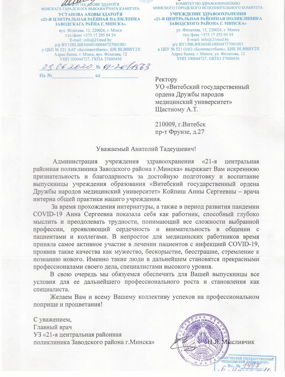 Администрация учреждения здравоохранения «21 -я центральная районная поликлиника Заводского района г.Минска» выражает Вам искреннюю признательность и благодарность за достойную подготовку и воспитание выпускницы учреждения образования «Витебский государственный ордена Дружбы народов медицинский университет» Койпиш Анны Сергеевны - врача интерна общей практики нашего учреждения.