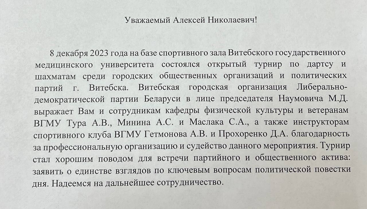 Витебская городская организация Республиканского общественного объединения "Белорусское Общество Красного Креста" выражает сердечную признательность лично Вам, всему трудовому и студенческому коллективу за постоянное содействие в благстворительной деятельности в нашей организации. Примите слова особой благодарности за активную жизненную позицию в деле служения идеям гуманизма и милосердия. Желаем крепкого здоровья, счастья, неиссякаемой энергии, мира и благополучия Вам и вашим семьям. Надеемся на дальнейшее взаимовыгодное сотрудничество. Просим Вас отметить и объявить благодарность за активное участие и значительный личный вклад в нашей совместной деятельности: проректора по воспитательной работе Болтрушевич Наталью Геннадьевну; методиста отдела по воспитательной работе с молодежью Навицкую Веру Анатольевуну; педагога- организатора Чакур Ольгу Ивановну.