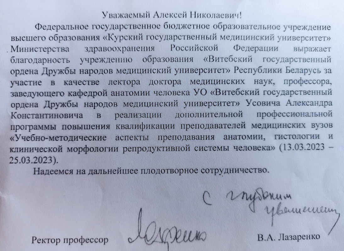 Благодарность от ректора Курского медуниверситета