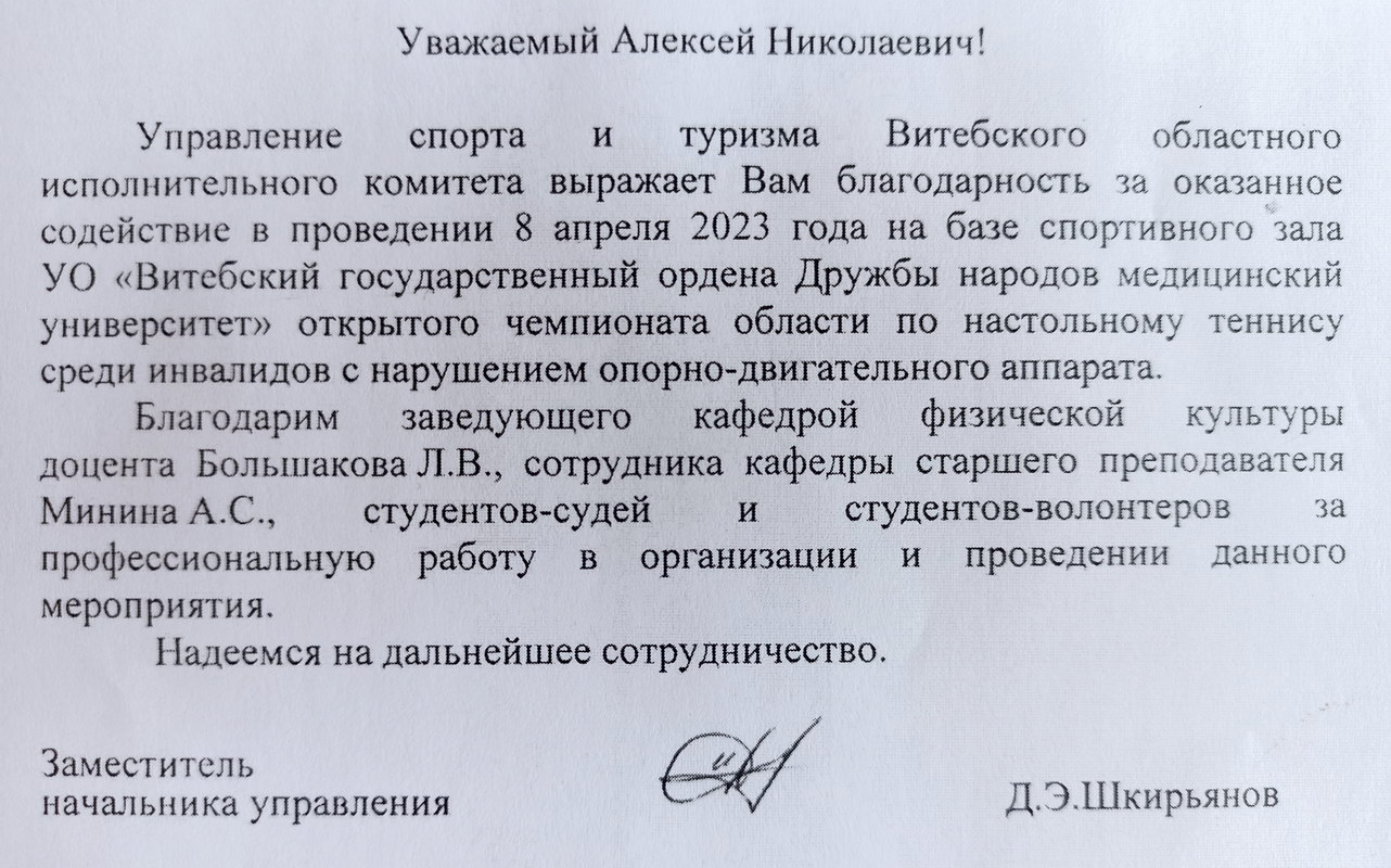 Благодарность от Управления спорта и туризма Витебского облисполкома
