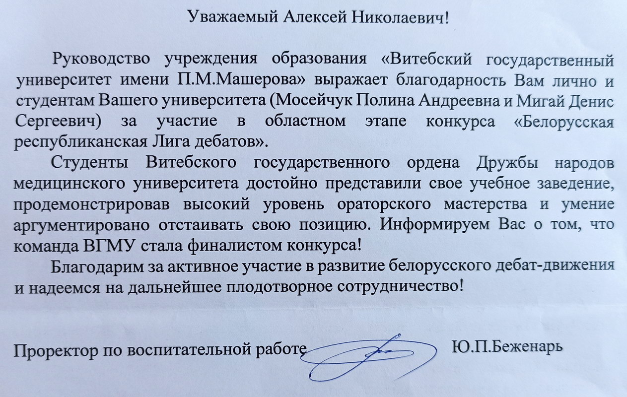 Благодарность от ВГУ им.Машерова