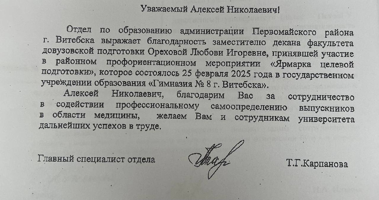 Благодарность заместителю декана факультета довузовской подготовки Ореховой Любови Игоревне (27.02.2025)