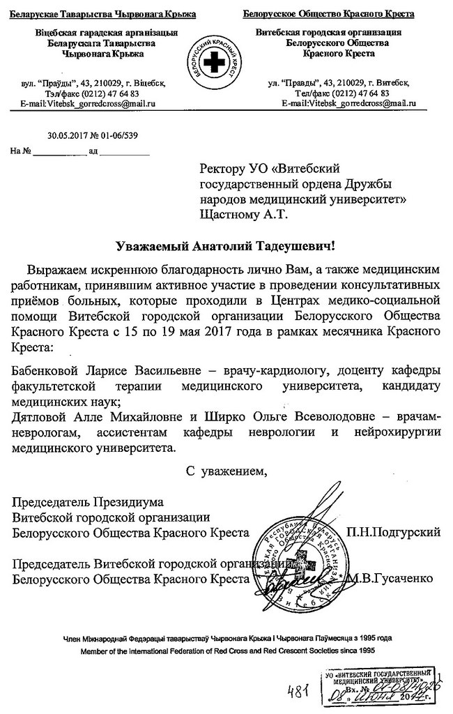 Выражаем искреннюю благодарность лично Вам, а также медицинским работникам, принявшим активное участие в проведении консультативных приёмов больных, которые проходили в Центрах медико-социальной помощи Витебской городской организации Белорусского Общества Красного Креста с 15 по 19 мая 2017 года в рамках месячника Красного Креста: