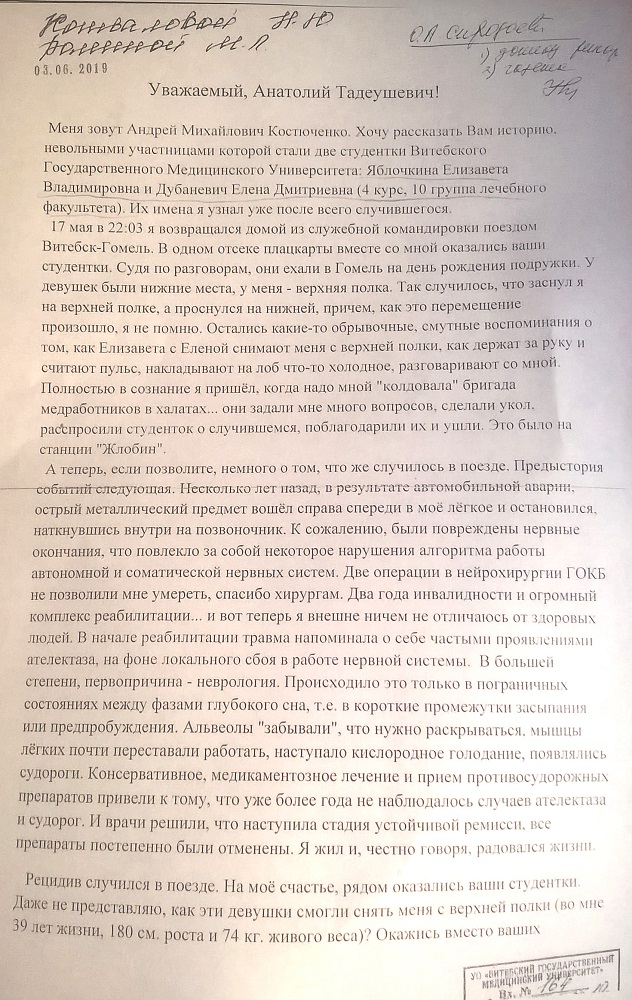 17 мая в 22:03 я возвращался домой из служебной командировки поездом Витебск-Гомель, в одном отсеке плацкарты вместе со мной оказались ваши студентки. Судя по разговорам, они ехали в Гомель на день рождения подружки. У девушек были нижние места, у меня - верхняя полка. Так случилось, что заснул я на верхней полке, а проснулся на нижней, причем, как это перемещение произошло, я не помню. Остались какие-то обрывочные, смутные воспоминания о том, как Елизавета с Еленой снимают меня с верхней полки, как держат за руку и считают пульс, накладывают на лоб что-то холодное, разговаривают со мной. Полностью в сознание я пришёл, когда надо мной "колдовала" бригада медработников в халатах... Они задали мне много вопросов, сделали укол, распросили студенток о случившемся, поблагодарили их и ушли. Это было на станции "Жлобин".