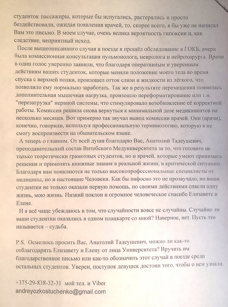 А теперь о главном. От всей души благодарю Вас, Анатолий Тадеушевич, преподавательский состав Витебского медуниверситета за то, что готовите не только теоретически грамотных студентов, но и врачей, которые умеют принимать решения и применять книжные знания в реальной жизни, в критической ситуации. Благодаря вам появляются не только высокопрофессиональные специалисты от медицины, но и настоящие Человеки. Как бы пафосно это не прозвучало, но ваши студентки не только оказали первую помощь, но своими действиями спасли мою жизнь. Низкий поклон и огромное человеческое спасибо Елизавете и Елене!