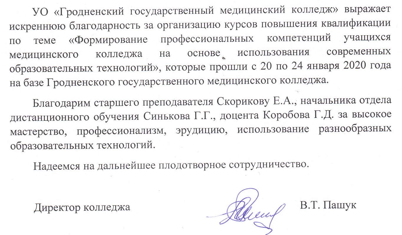 УО «Гродненский государственный медицинский колледж» выражает искреннюю благодарность за организацию курсов повышения квалификации по теме «Формирование профессиональных компетенций учащихся медицинского колледжа на основе использования современных образовательных технологий», которые прошли с 20 по 24 января 2020 года на базе Гродненского государственного медицинского колледжа.