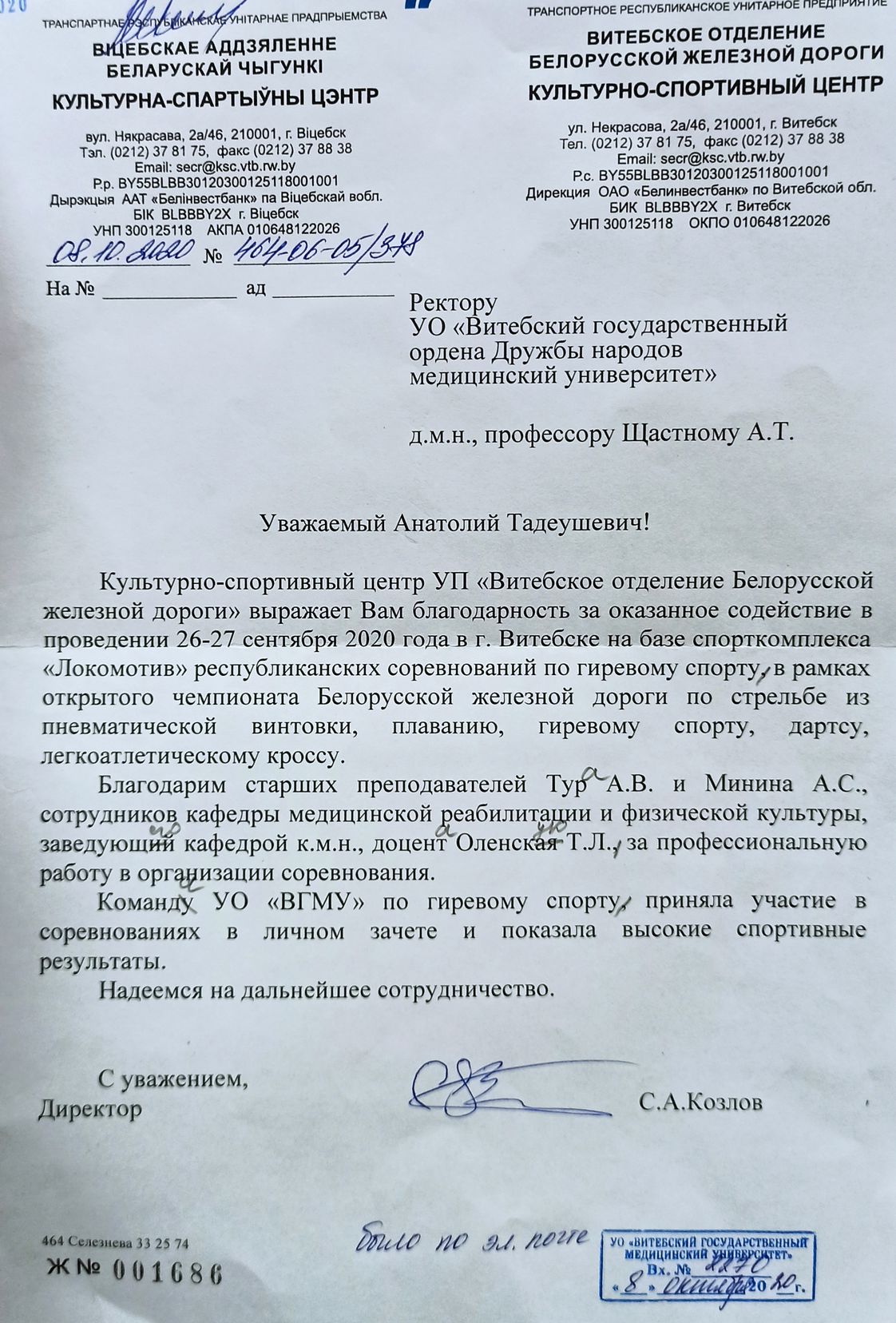 Культурно-спортивный центр УТТ «Витебское отделение Белорусской железной дороги» выражает Вам благодарность за оказанное содействие в проведении 26-27 сентября 2020 года в г. Витебске на базе спорткомплекса «Локомотив» республиканских соревнований по гиревому спорту в рамках открытого чемпионата Белорусской железной дороги по стрельбе из пневматической винтовки, плаванию, гиревому спорту, дартсу, легкоатлетическому кроссу.