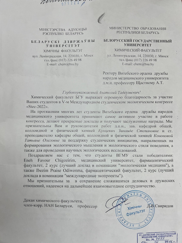 УО "Витебский государственный ордена Дружбы народов медицинский университет", 210009, г. Витебск, пр-т Фрунзе, 27