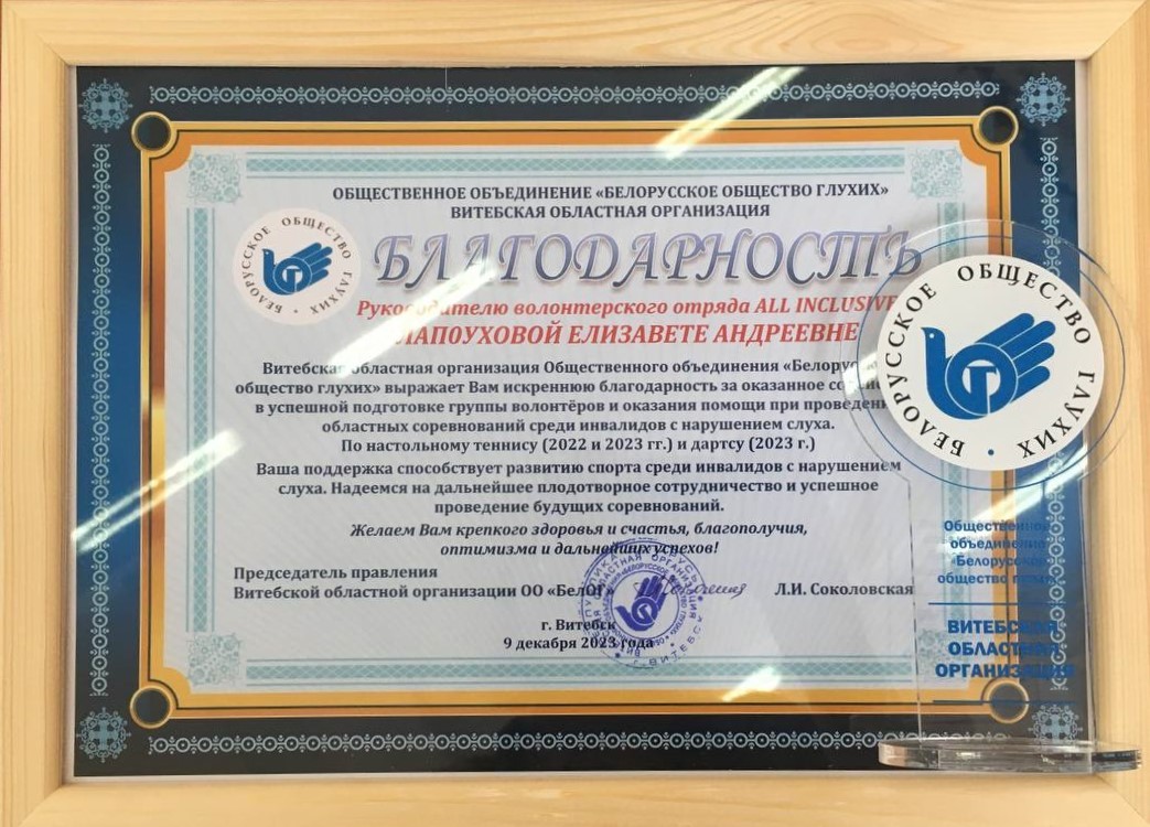 At the end of the competition, the head of the volunteer team “ALL INCLUSIVE. ALL INCLUDED” Elizaveta Lapoukhova was presented with gratitude by the Vitebsk regional organization of the “Belarusian Society of the Deaf” for the assistance provided in the successful training of volunteers and assistance in holding regional competitions among people with hearing impairments in table tennis and darts.