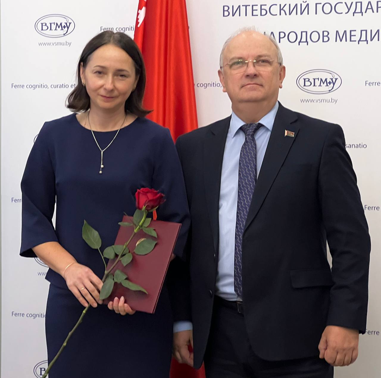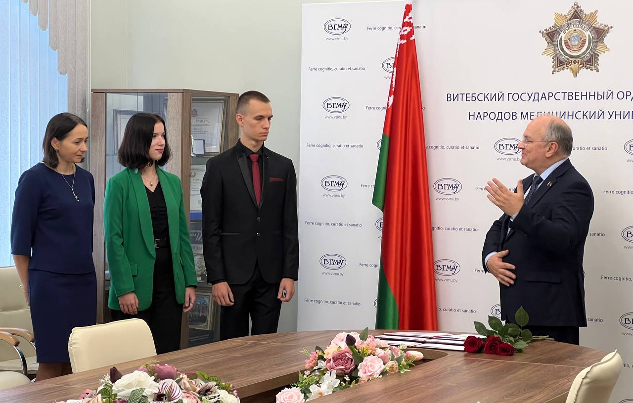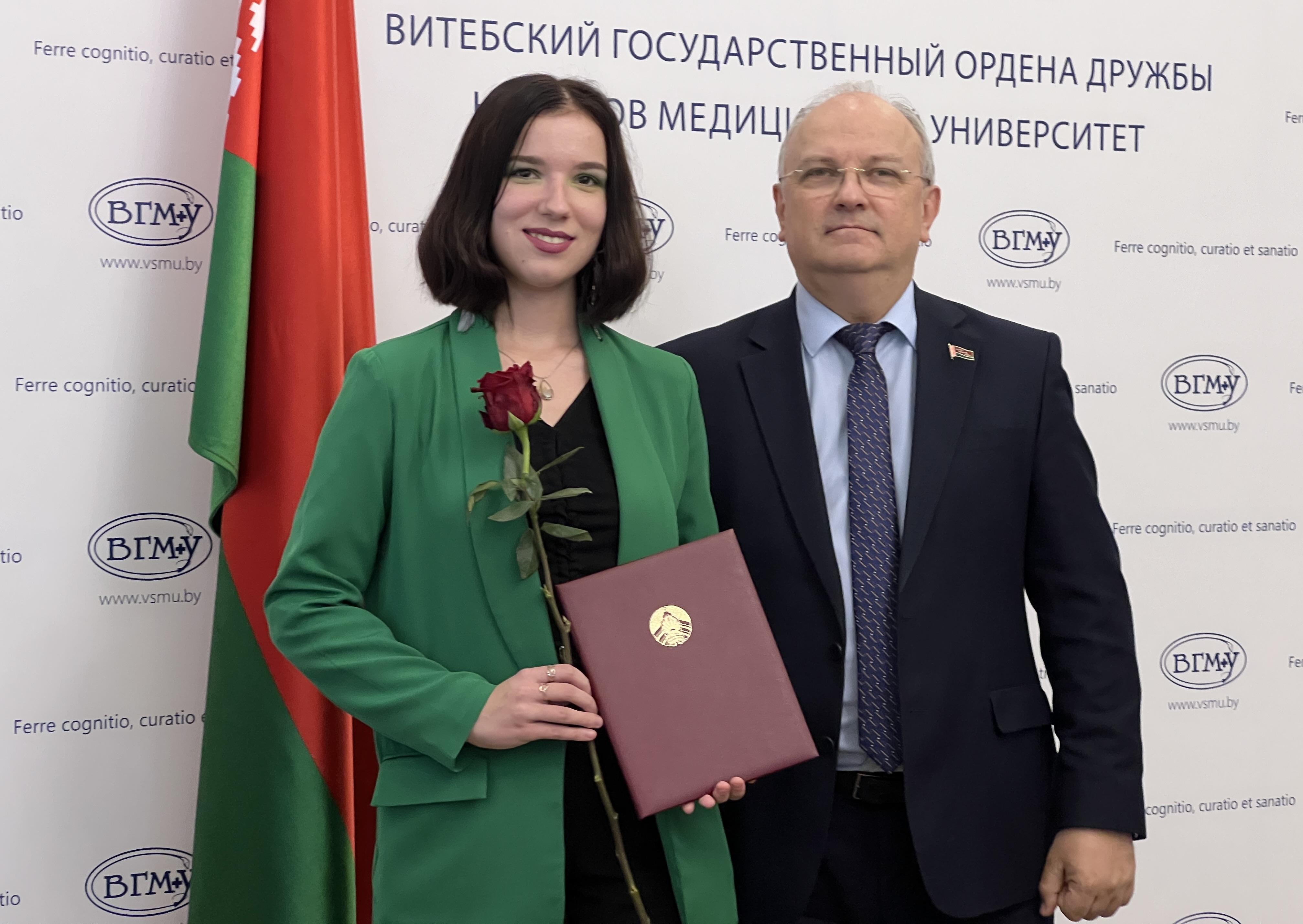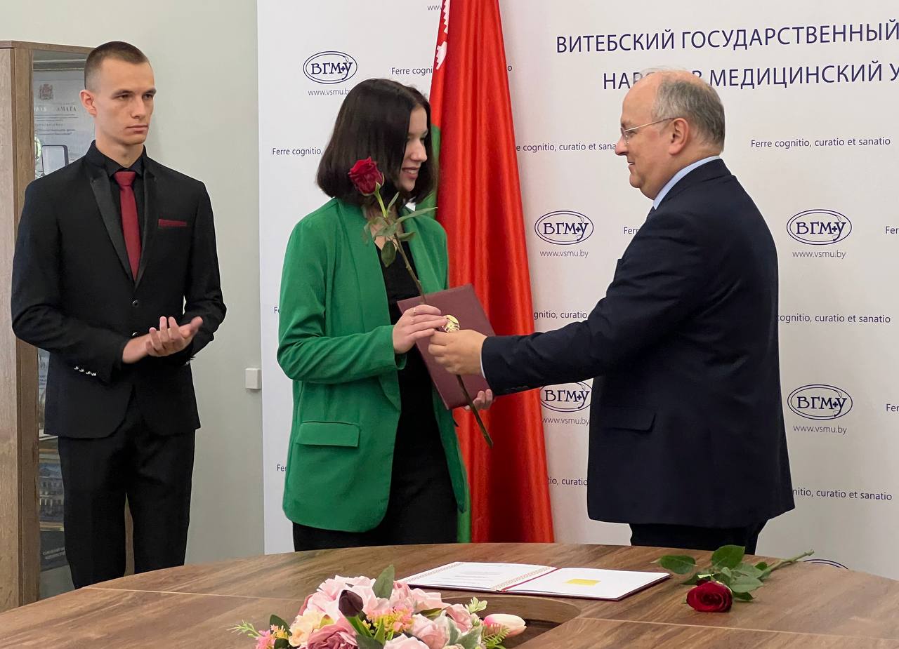 On October 10, 2024, the rector of VSMU Alexey Chukanov presented the Certificate of Awarding a Special Prize for Special Contribution to the Development of Abilities of Gifted Pupils and Students to Maria Sabodina, the Associate Professor of the Department of Pharmaceutical and Toxicological Chemistry, as well as Certificates of Awarding a Scholarship of the President of the Republic of Belarus to the 3rd-year students Pavel Aleksandrov and Yana Kaznovetskaya.