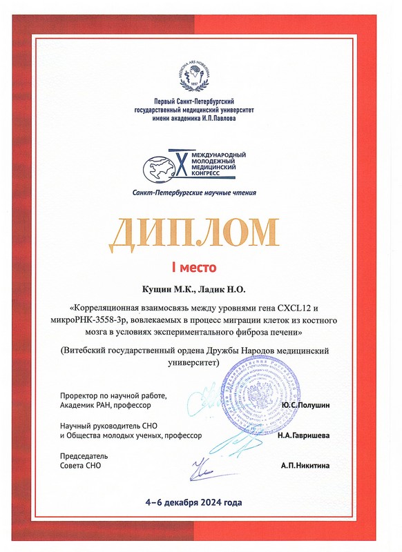 The scientific work of the 3rd year students of the Faculty of Medicine Kushchina M.K. and Ladik N.O. "Correlation relationship between the levels of the Cxcl12 gene and microRNA-3558-3p involved in the process of cell migration from the bone marrow under conditions of experimental liver fibrosis" (supervisor – the Associate Professor of the Department of Histology, Cytology and Embryology Lebedeva E.I.) took first place and was recognized as one of the best. The 6th year student Belyaeva D.A. received a 3rd degree diploma. The 4th and 6th year students Kizimenko A.A. and Nesterenok A.I. received participant certificates.