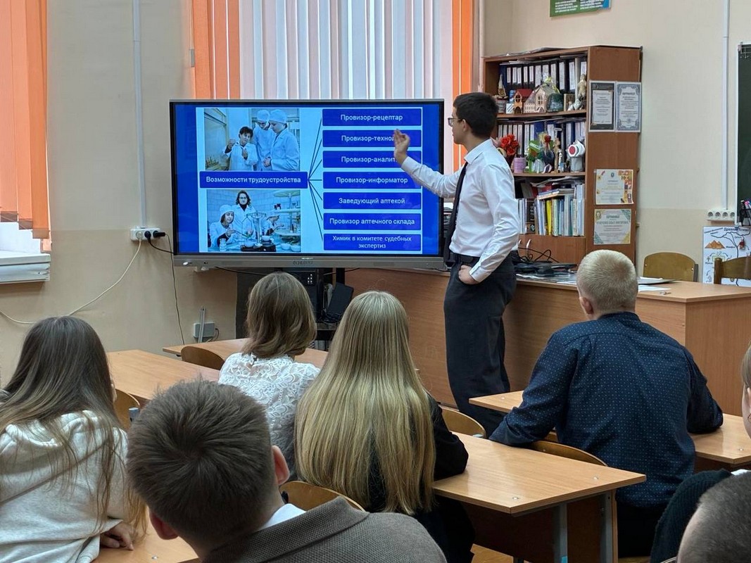 On October 31, 2025, first-year students of the Stomatological Faculty and General Medicine Faculty, Fedor Chevankov and Ekaterina Pyanova, conducted career guidance meetings with students in grades 10–11 at the grounds of the State Educational Establishment "Secondary School No. 2 named after V.M. Kolesnikov Rogachev" and the State Educational Establishment "Gymnasium No. 4 Mogilev."