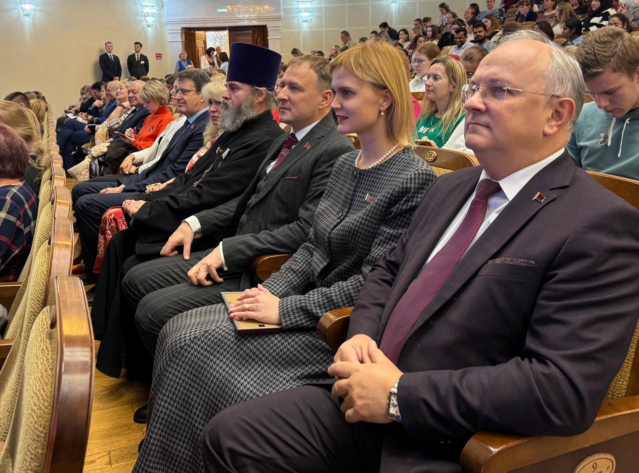 That evening, the Vitebsk Concert Hall welcomed the university administration, faculty, employees, and students. The honored guests included Olga Ivanova, Chairman of the Vitebsk City Council of Deputies; Vladimir Plytkevich, Chairman of the Vitebsk regional organization of the Belarusian Trade Union of Healthcare Workers; and Archpriest Sergei Zakharov.