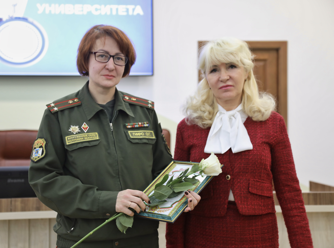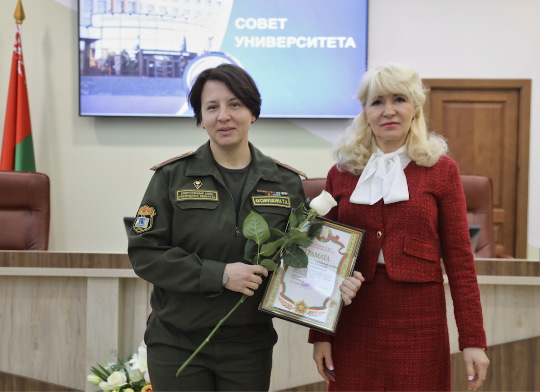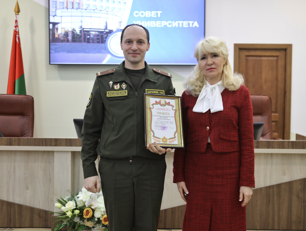 On January 23, 2026, a meeting of the University Council was held. During the meeting, the Diploma of the Minister of Defense of the Republic of Belarus for 3rd place in the review competition for the best military department of higher education institutions in the 2024/2025 academic year was awarded to the military department. Additionally, diplomas were awarded for diligence and distinction in service, achievements in professional activities, and demonstrated reasonable initiative to: Lieutenant Colonel of Medical Service Tatiana Aksinushkina and Lieutenant Colonel of Medical Service Arseniy Tsygankov