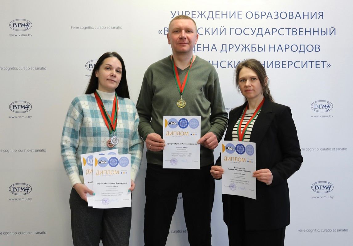 On February 9, 2026, an award ceremony was held for the winners and prize-winners of the Spartakiad among university employees who are members of the trade union. Certificates of honor and prizes were presented by Vladimir Plytkevich, Chairman of the Vitebsk Regional Committee of the Belarusian Trade Union of Healthcare Workers, and Dmitry Kuzhel, Vice-Rector of Ideological and Educational Work.