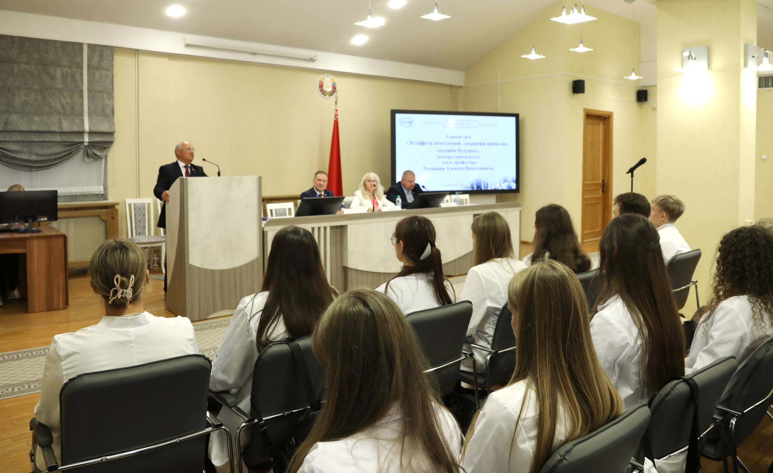 At Vitebsk State Medical University, this lesson took on a special significance. Future healthcare professionals – those who will be responsible for safeguarding the health of the nation in the 21st century – participated in engaging conversations with Rector Aleksei Chukanov, First Vice-Rector Alina Shcupakova, Vice-Rector for International Relations and Organizational-Legal Work Denis Lits, and Vice-Rector for Ideological and Educational Work Dmitry Kuzhel.