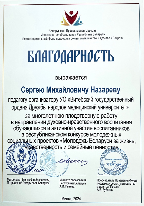 Based on the results of the Republican competition the project leader, teacher-organizer Sergey Nazarev was awarded the Gratitude of the Ministry of Education of the Republic of Belarus, the Belarusian Orthodox Church and the Charitable Foundation for the Support of Family, Motherhood and Childhood “Pokrov” for many years of fruitful work in the direction of spiritual and moral education of students and the active participation of students in the competition.