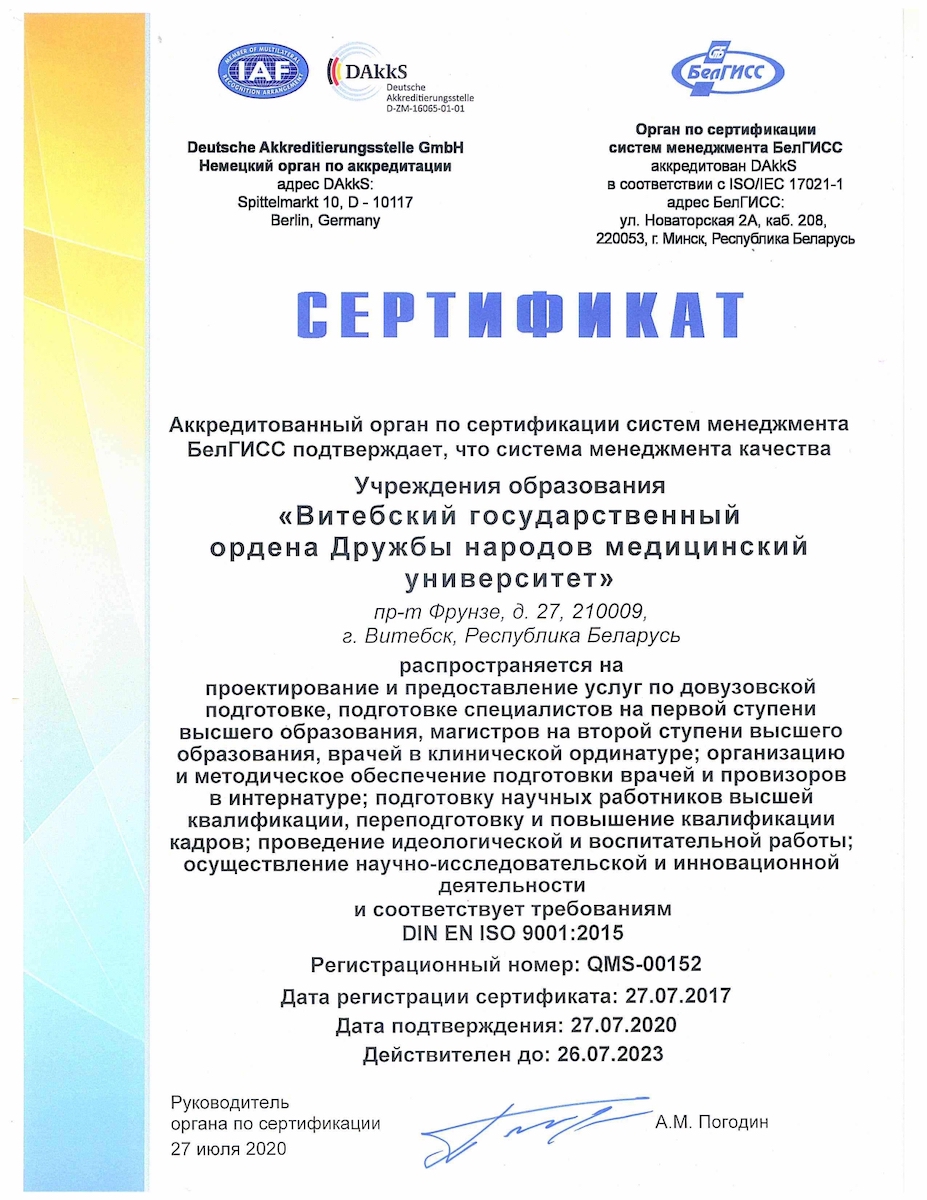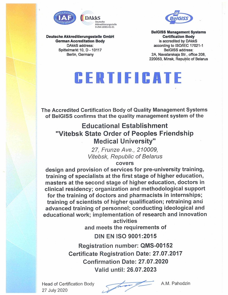 УО "Витебский государственный ордена Дружбы народов медицинский университет", 210009, г. Витебск, пр-т Фрунзе, 27