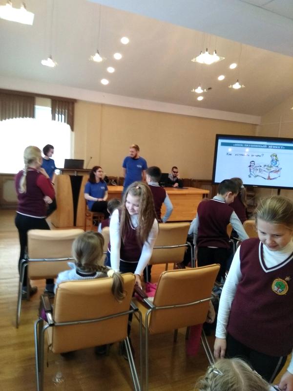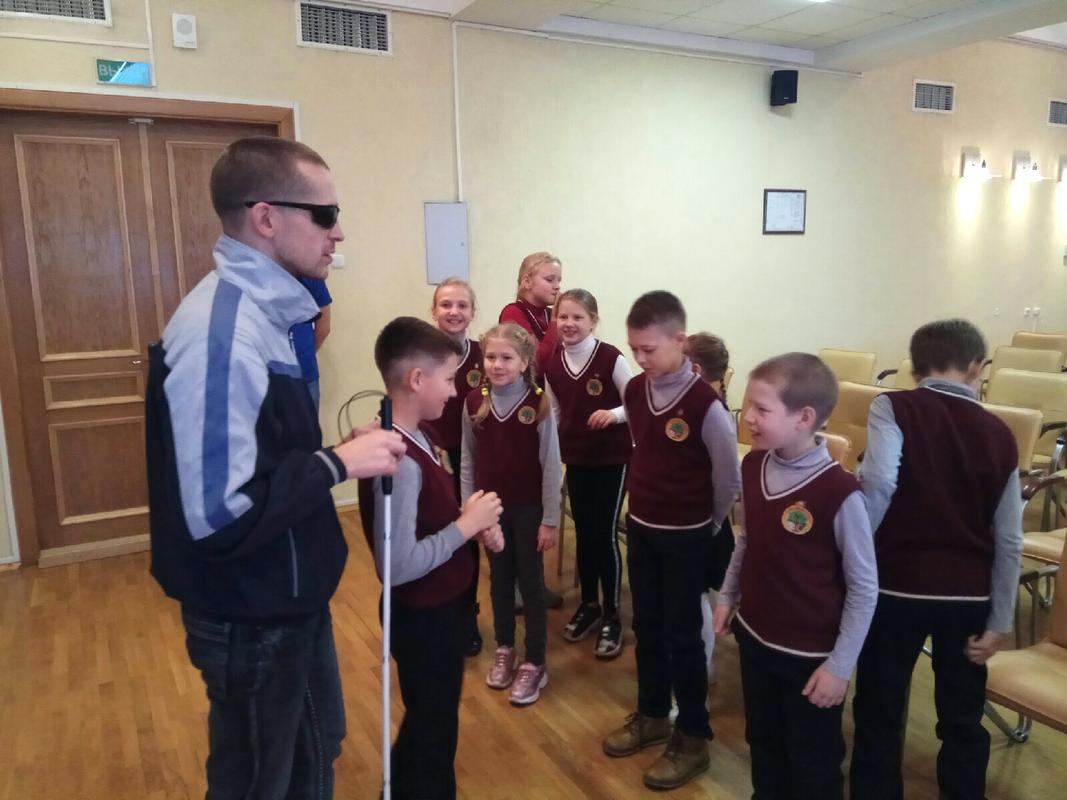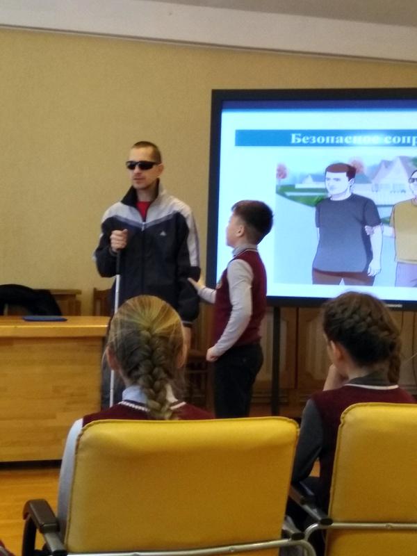 Школьникам была показана наглядная презентация о взаимодействии с незрячими людьми и с людьми с нарушением опорно-двигательного аппарата (колясочниками), были подробно разъяснены особенности поведения с такими людьми, как лучше и какую именно помощь они могут оказать людям с инвалидностью в повседневной жизни.