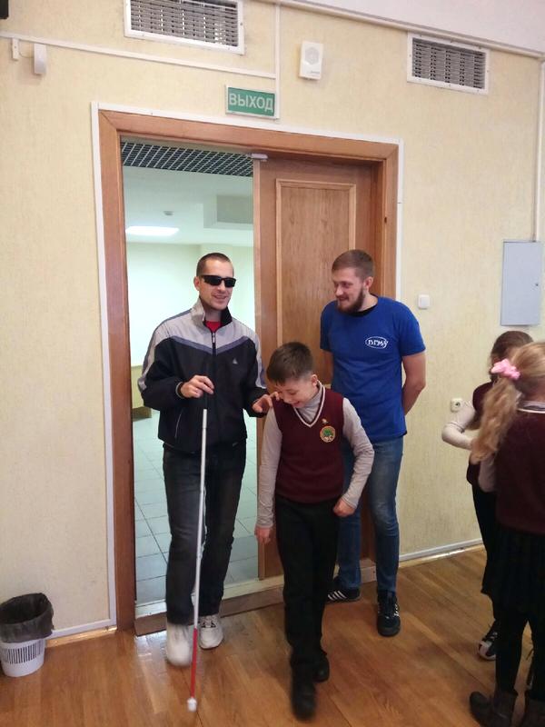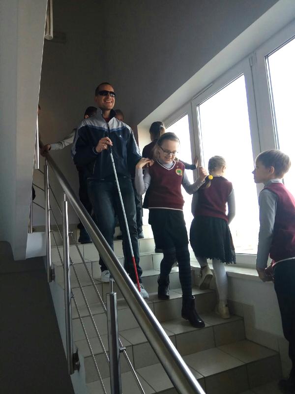 Получив необходимые теоретические знания, школьникам была предоставлена возможность применить их на практике, где они поочерёдно помогали незрячему человеку сесть на стул, перейти через проезжую часть, пройти через дверной проём, подняться и спуститься по лестнице.