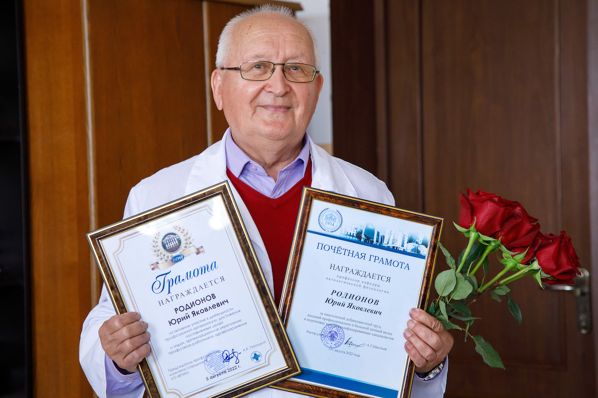 В августе доктору медицинских наук, профессору Юрию Яковлевичу Родионову исполнилось 85 лет. Юрий Яковлевич родился в 1937 году в селе Наяхан Северо-Эвенского района Дальневосточного края в семье военнослужащего. В 1961 году окончил с отличием Витебский медицинский институт и был принят на работу в ВГМИ, где с 1961 по 1996 год прошёл путь от аспиранта до заведующего кафедрой. С 2001 года и по настоящий день Ю.Я.Родионов занимает должность профессора кафедры патологической физиологии.
