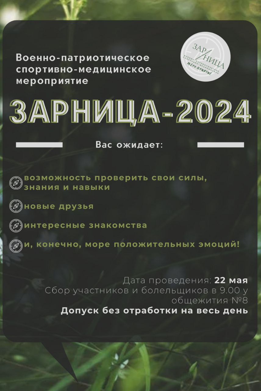 Приглашаем вас на военно-патриотическое спортивно-медицинское мероприятие «Зарница-2024», приуроченное к 80-летию освобождения Беларуси от немецко-фашистский захватчиков и 90-летию Витебского государственного ордена Дружбы народов медицинского университета.